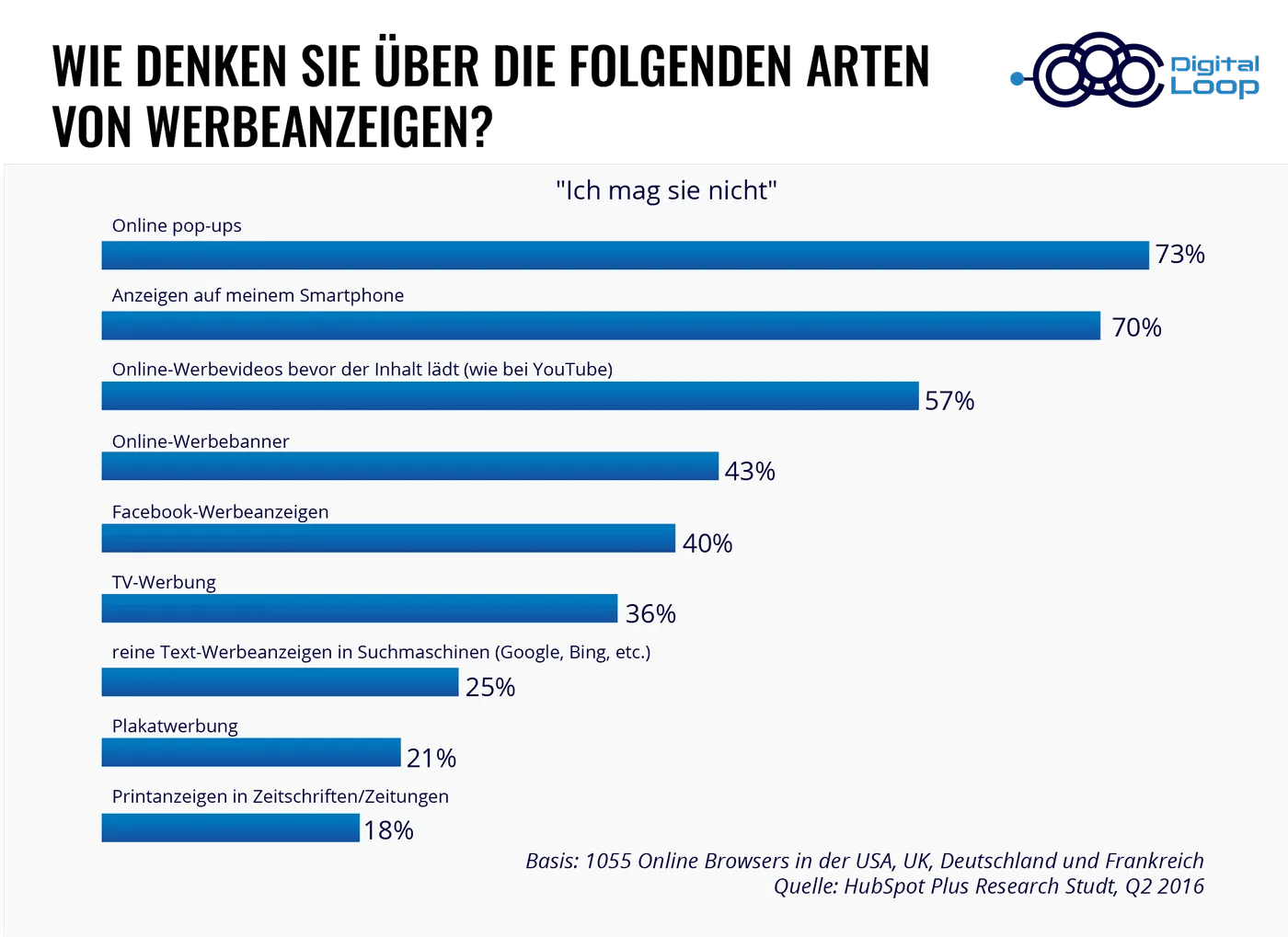 Besonders hoch ist die Ablehnung bei Pop-ups (73 %), mobiler Werbung (70 %) und Video-Interstitials (57 %). Dagegen werden Printanzeigen in Zeitschriften (18 %) und OOH-Werbung (21 %) selten als störend empfunden, wie diese Studie zeigt: