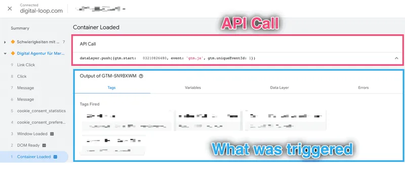 Sie können einen einzelnen API-Aufruf anzeigen, indem Sie ein Ereignis aus dem Ereignisstrom auswählen. Sie können dann den tatsächlichen API-Aufruf sehen, einschließlich aller Ausgabeinformationen (d.h. Tags, Variablen, Fehler usw.), die durch diesen API-Aufruf ausgelöst wurden.