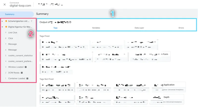 - Als Punkt 1 sehen wir die Registerkarten, auf denen wir zwischen Tags, Variablen, Data Layer-Einträgen und Fehlern, die auf der Ebene eines beliebigen Data Layer-Ereignisses aus dem Ereignisstrom aufgetreten sind, navigieren können.