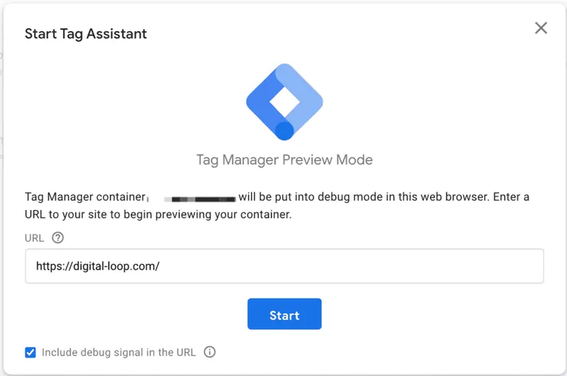 Beim Klick auf den Vorschau-Button in Ihrem Browser-Container, werden Sie nun zu einer separaten Web-Anwendung unter tagassistant.google.com weitergeleitet. Dort müssen Sie die URL eingeben, unter der Sie das Debugging starten möchten.