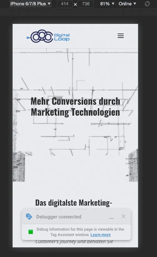 Wenn Sie den neuen Debugger zusammen mit der Chrome-Erweiterung des Tag Assistant verwenden, wird dieser in einem neuen Browserfenster geöffnet, so dass wir mobile Emulationen ausführen und unsere Tracking-Setups bequem debuggen können. Wenn Sie noch nie mobil debuggt haben – glauben Sie mir, diese Funktion macht es zu einem Kinderspiel