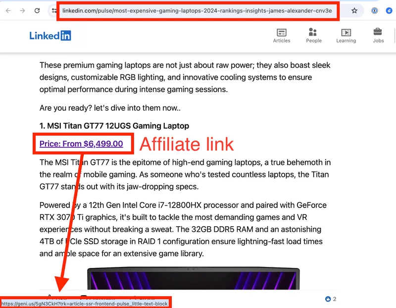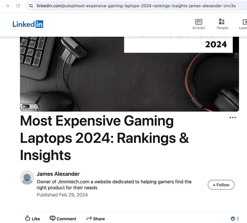Ein Vermarkter veröffentlicht einen Artikel mit dem Titel „Most Expensive Gaming Laptops 2024“ auf einem beliebten Tech-Blog durch einen Gastbeitrag oder auf einer hochrangigen Website wie LinkedIn oder Medium.