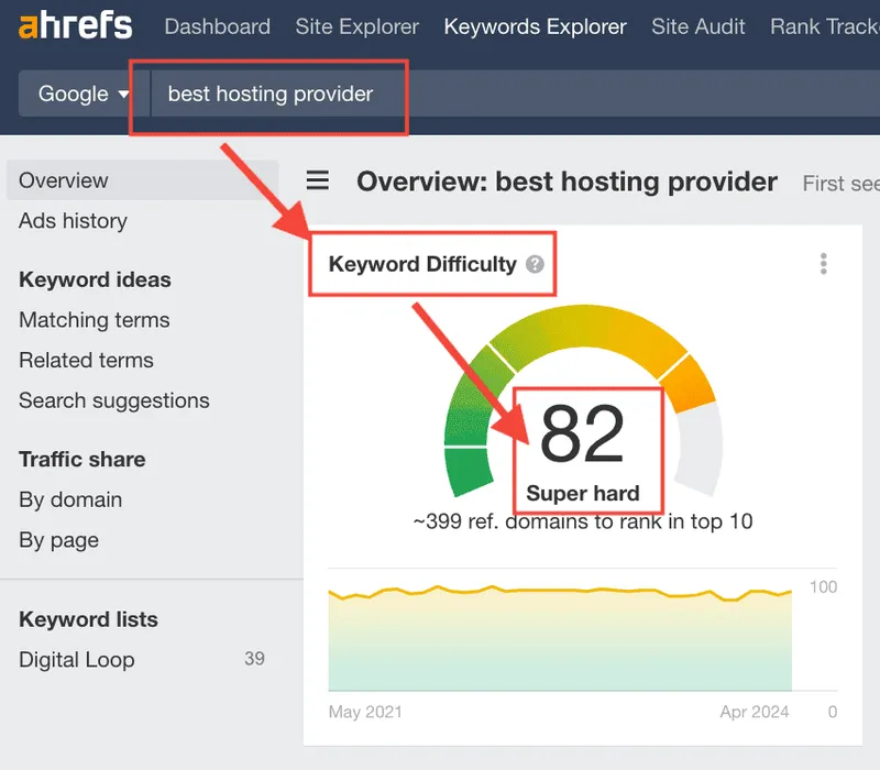 Wie Sie sehen können, hat dieses Keyword laut Ahrefs-Daten einen „super hard“ Schwierigkeitsgrad, was bedeutet, dass es schwierig sein könnte, unter den Top 10 zu erscheinen.