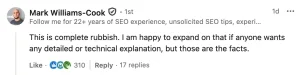 Der Beitrag wurde zum Hit. Über 500 Likes, mehr als 400 Kommentare und jede Menge Liebe. SEOs waren jedoch nicht beeindruckt…