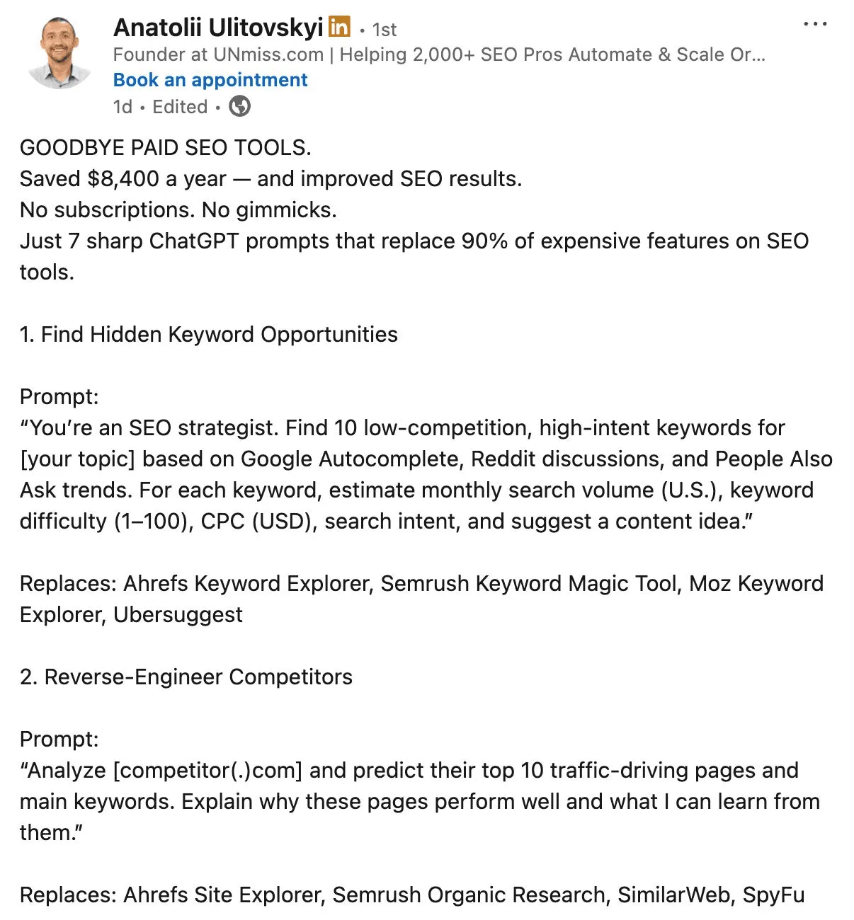 Agenten können wiederkehrende Analysen durchführen, die Menschen normalerweise aufschieben: wöchentliche Überprüfungen der SEO-Abdeckung, monatliche Erkennung von Content-Verfall, kontinuierliche Überwachung der Konkurrenz. Die Art von Arbeit, die wertvoll ist, aber selten Priorität hat, weil sie langweilig und zeitaufwändig ist.
