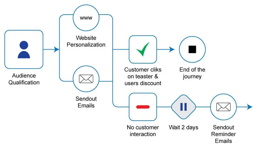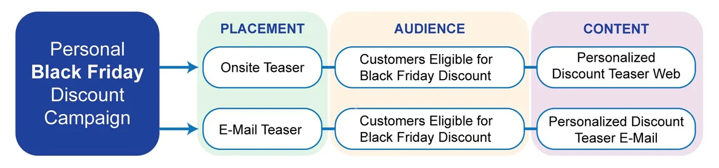 Let’s summarize everything up to this point: we have created personalized content for our onsite teasers and our emails. We included this personalized content in our email template and on the website. The last requirement missing is the one regarding how to orchestrate our personalization across the customer journey: When is the customer seeing which content and where?