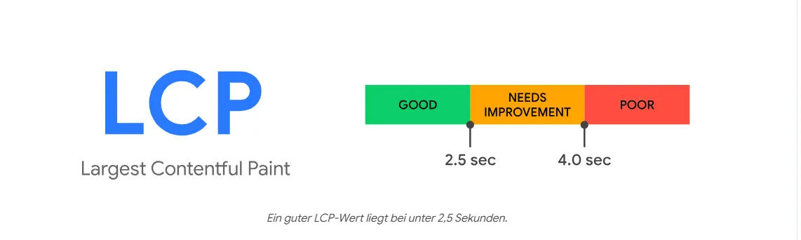 • Largest Contentful Paint (LCP): This measures how quickly the largest element on your page loads. Ideally, it should load in 2.5 seconds or less (75th percentile): This means that out of 100 user experiences, at least 75 should have a load time of 2.5 seconds or less. If competitors’ websites take more than 4 seconds to load their largest element, this can be considered poor performance. Between 2.5 and 4 seconds lies a gray area that, while not bad, still needs improvement.