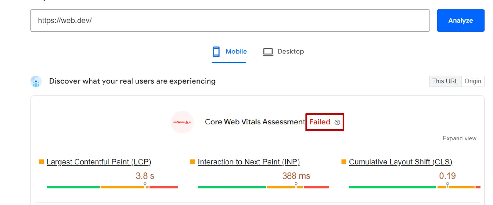If your competitor’s website does not meet all three metrics, PageSpeed ​​Insights will display an error status like this: “Failed”.
