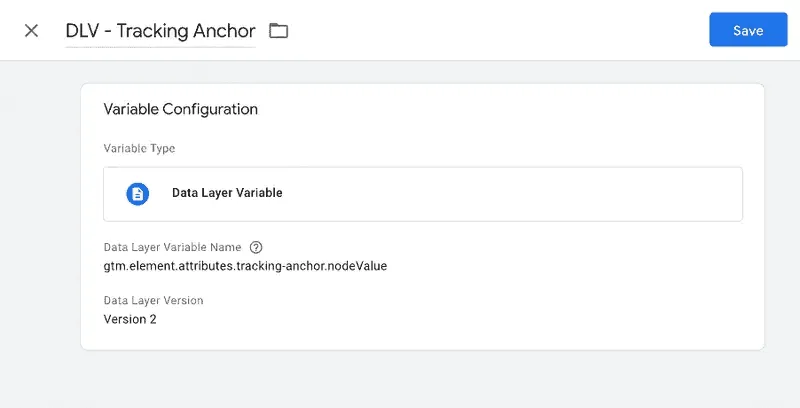 - Create a Data Layer Variable which will store the node value of our “tracking-anchor” from DOM on every click. Use the following path to query every Data Layer element: gtm.element.attributes.tracking-anchor.nodeValue