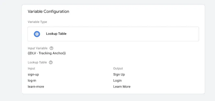 - Create a Lookup Table with the above Data Layer Variable as an Input Variable. Now, use the “tracking-anchor” values as Input fields and write a formatted, understandable name in the Output fields. We do this, because we will use the Output fields as Event Label in our Google Analytics Tag. Therefore, we need a clean, easily interpretable piece of qualitative data.