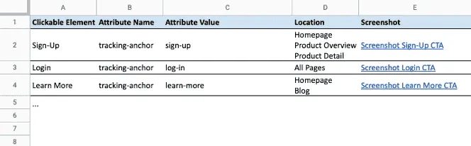<button href="https://www.example.com/more" tracking-anchor="learn-more">Learn More</button>I highly recommend to structure the list of elements, attribute names and their values. Believe me, later this will make you sleep better at night. Consider including this in your Measurement Plan, something like this table: